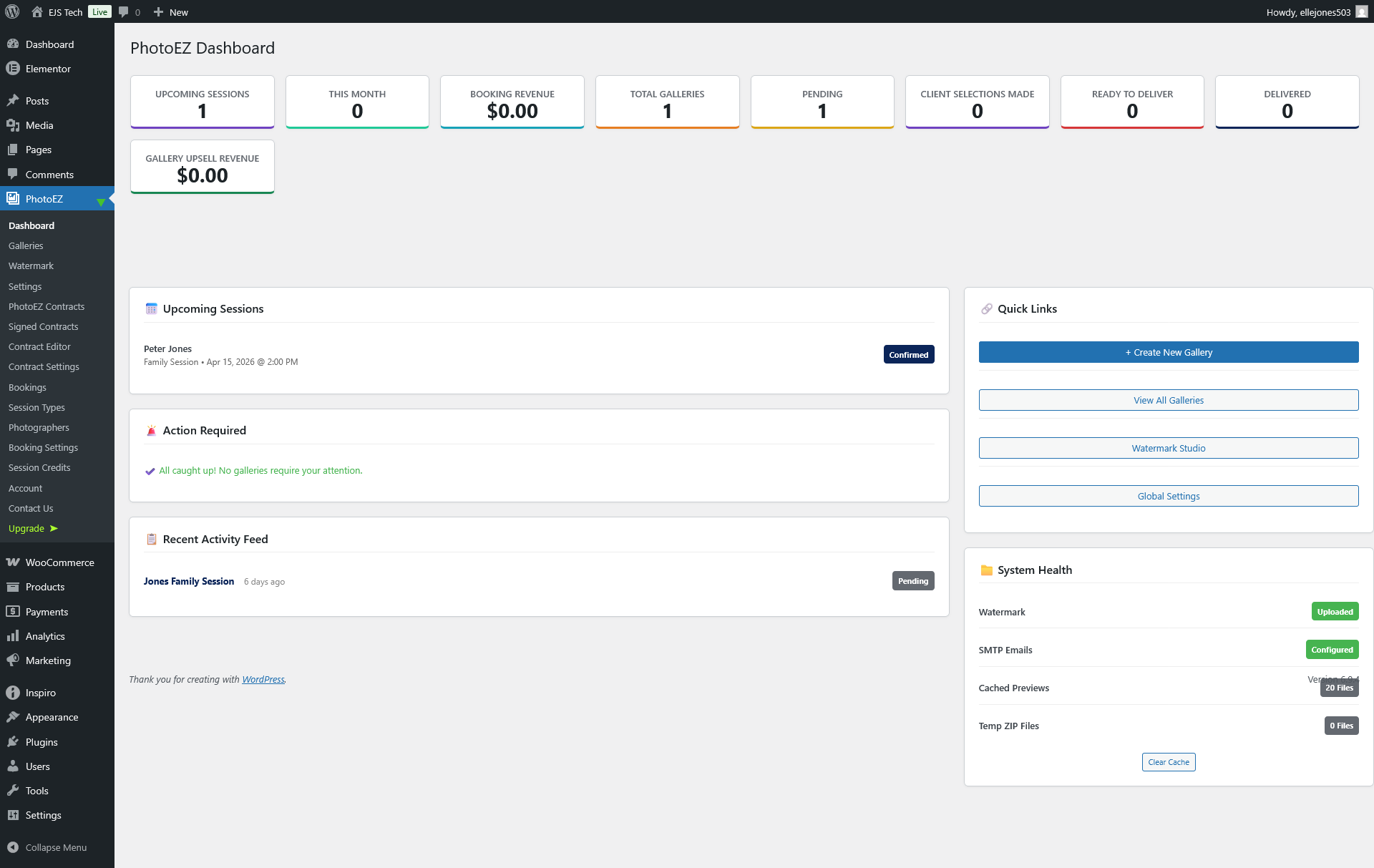 Booking analytics on dashboard See upcoming sessions, this month’s bookings and booking revenue, plus quick links to manage everything from your PhotoEZ dashboard.