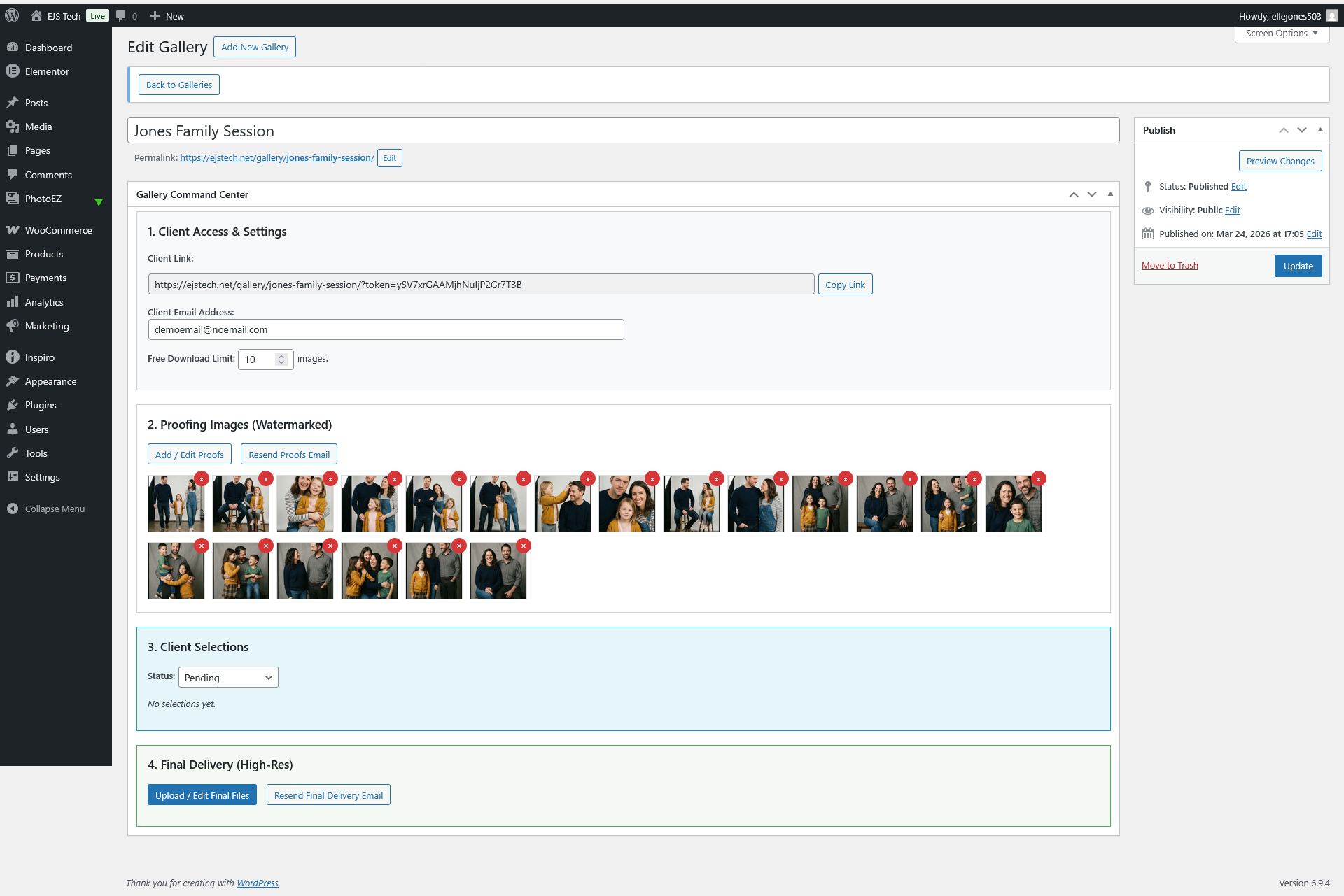 Email notifications Automatic emails to clients when proofs are ready and when final images are available, plus admin alerts when clients submit selections.