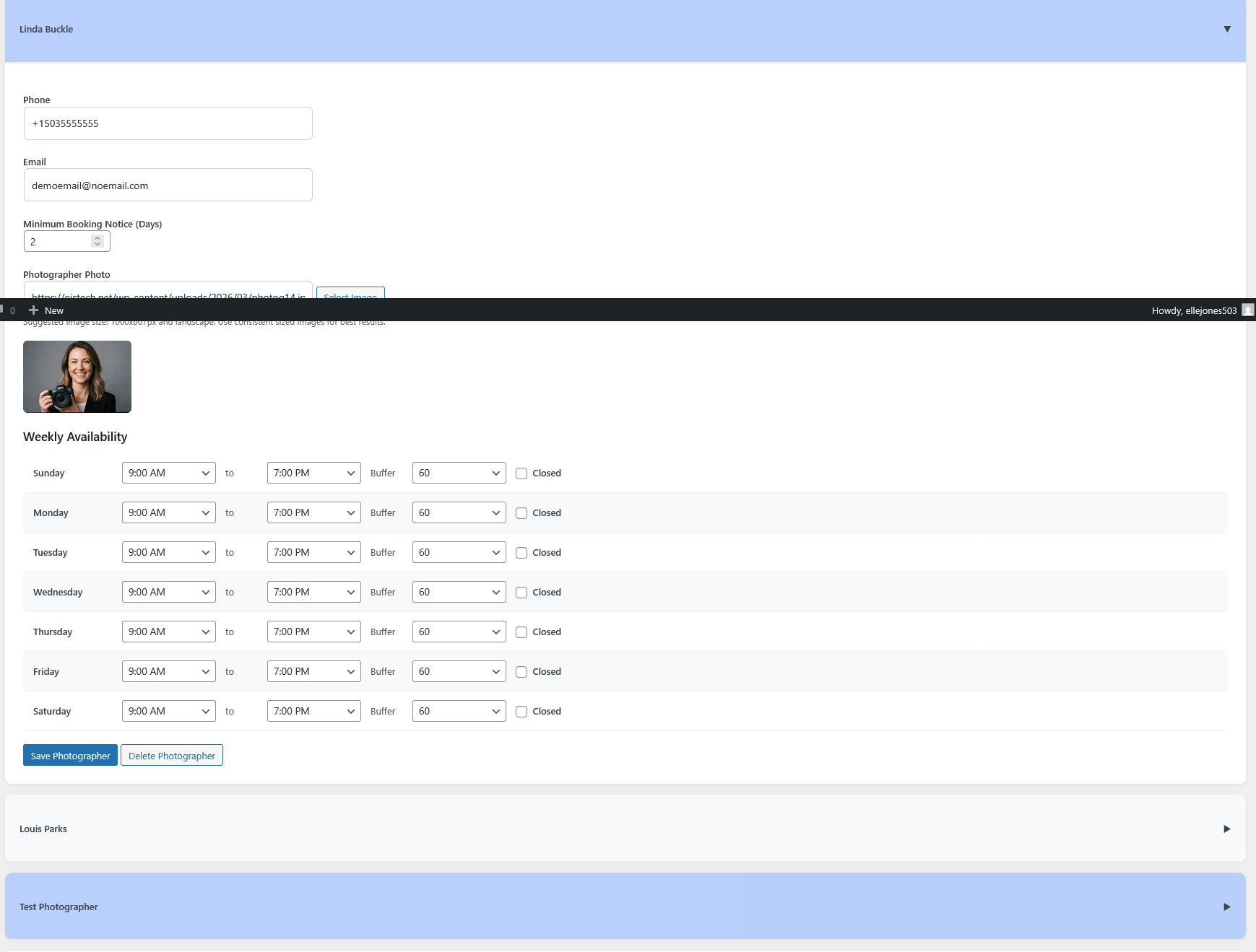 Photographer management Add photographers, set their weekly availability, minimum booking notice, and assign bookings to specific people.