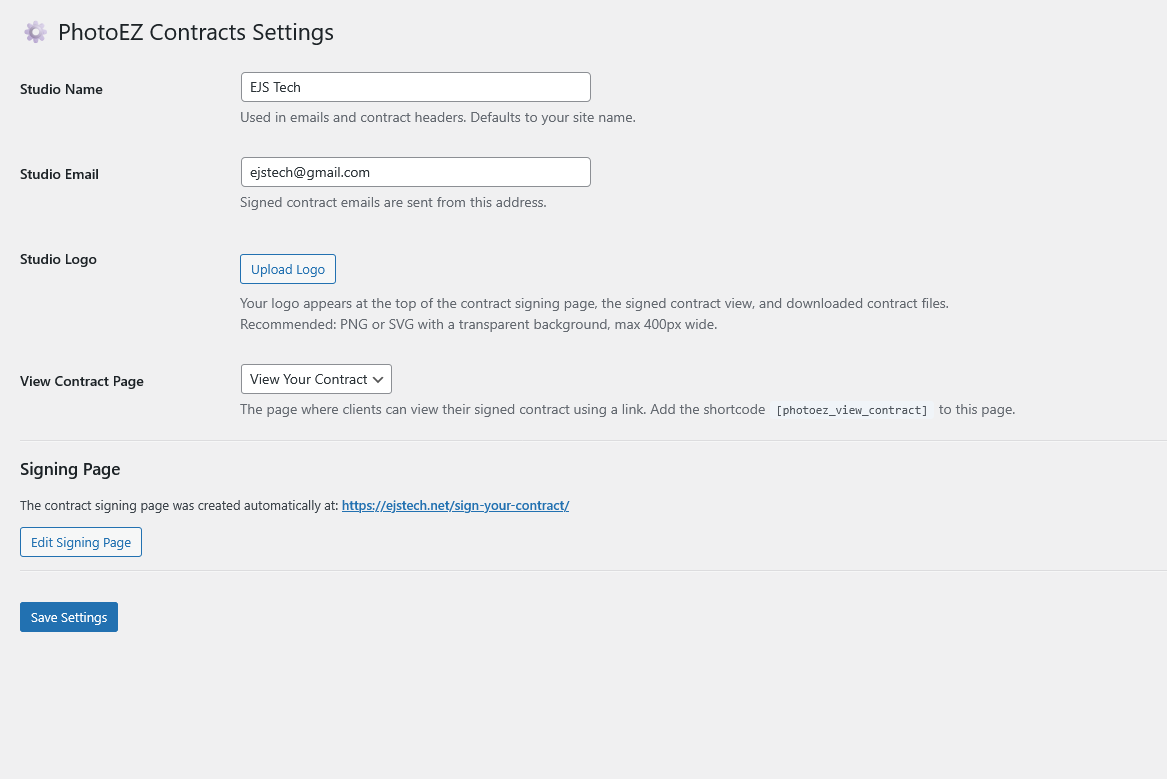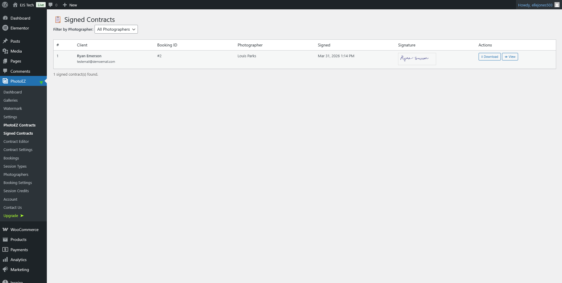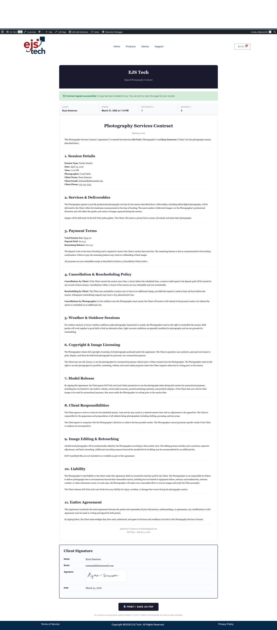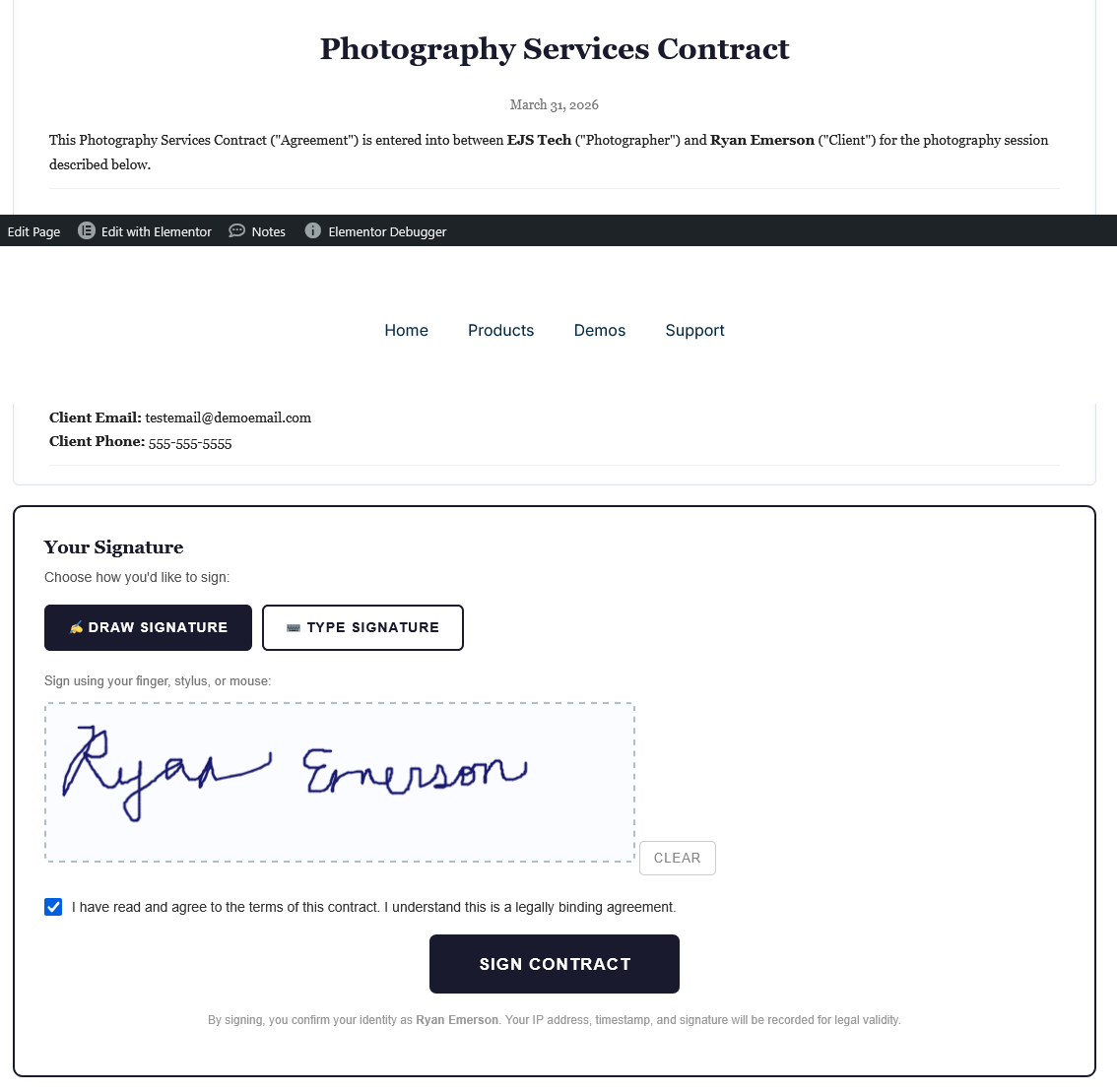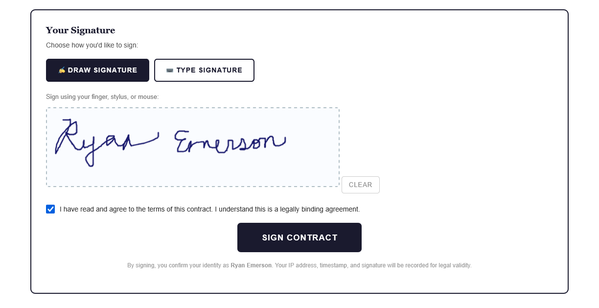Every signed contract records the client's name, email, signature, date and time of signing, and IP address Signed contracts are stored permanently in the WordPress database and cannot be altered after signing