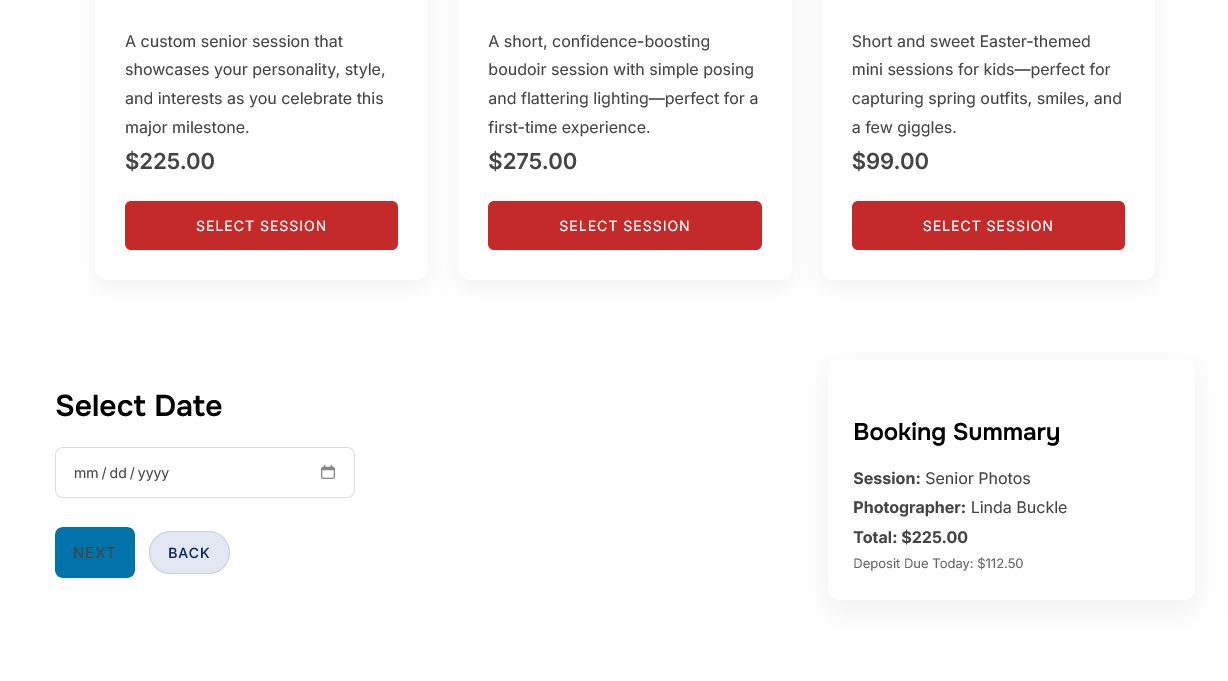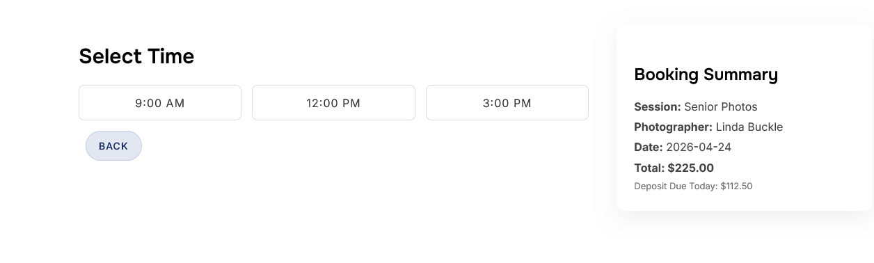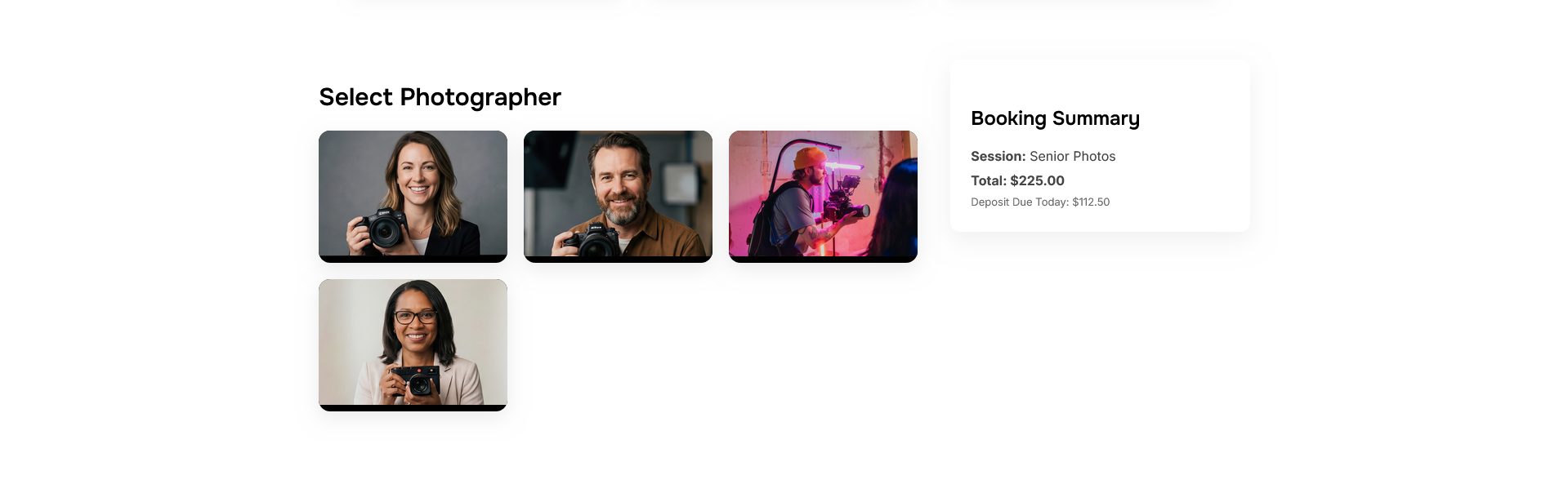 Front‑end booking flow A simple, guided booking experience where clients pick a session type, photographer, date, and time.