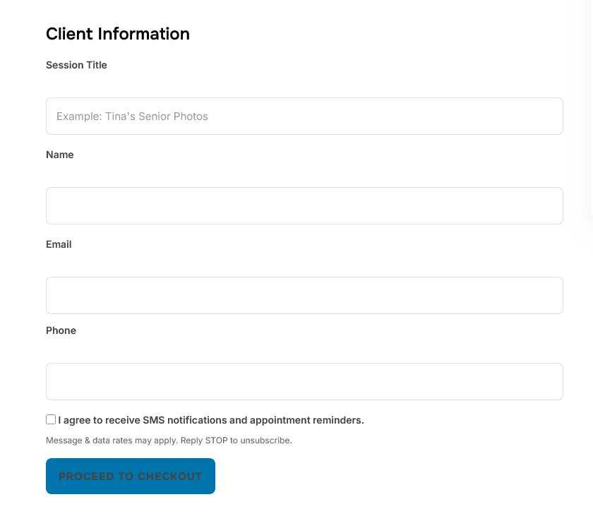 Custom session types Define sessions (e.g., seniors, maternity, family) with price, duration, location, included photos, and deposit percentage.