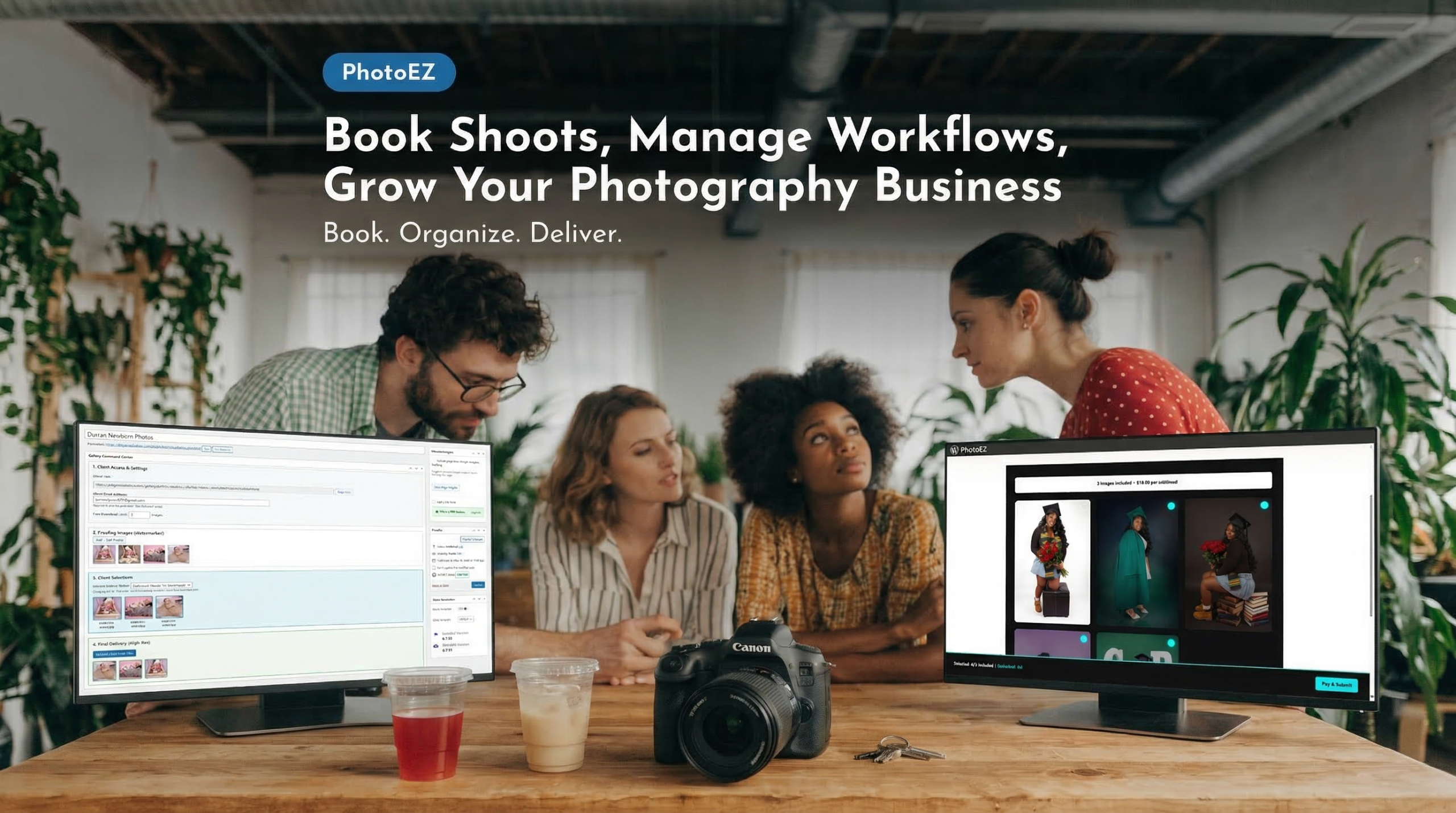 PhotoEZ and the PhotoEZ Booking Add‑on work together to give you a complete client experience—from online booking to final image delivery. Clients can easily schedule sessions, receive automated confirmations and reminders, review their watermarked proofs, select favorites, and download final high‑res images, all through a clean, branded gallery that keeps your workflow organized and stress‑free.